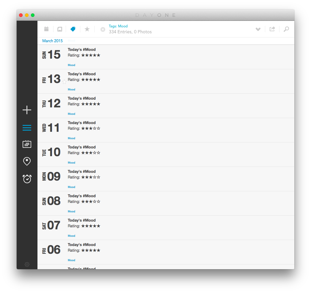 For one reason or another, it might be conceivable that one might stop using Exist, or at least to store moods in a more permanent location. I had no idea the amount of value I’d place on the mood rating system until I had been using it for some time. Having already expressed my love of Day One with ETD, it only made sense to build a similar tool for Exist’s mood data.